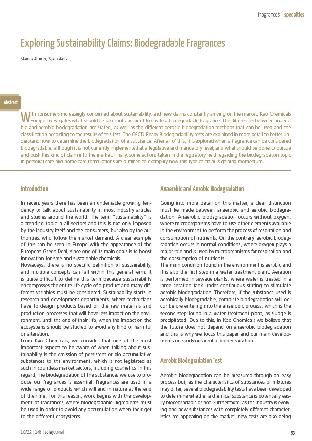 Kao Chemicals Europe is investigating what should be taken into account to create biodegradable fragrances. After instensive research, some great results came up...